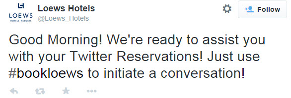 Social bookings: Hotels looking to make reservations easy on the guest are investigating into social bookings. Loews Hotels assists guests with reservations on Twitter when a user uses the hashtag #BookLoews. Loews will continue the conversation before sending a secure payment link to the Twitter user.