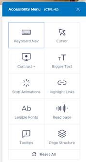 This widget will automatically be installed on all Cloud PMS clients that utilize the online booking engine. This widget is visible to every user that enters your property’s booking engine and can be accessed in the lower left-hand corner of the screen. The purpose of this widget is to provide those with disabilities the tools they need to assist them in navigating the online booking experience.