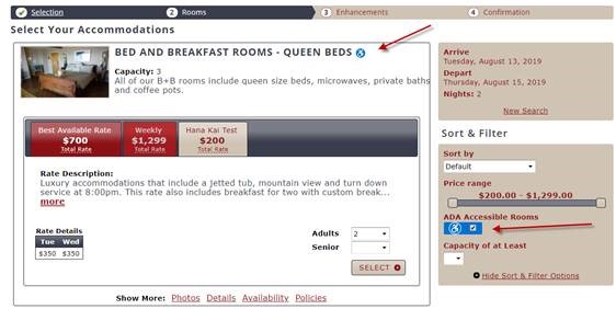 On both step 1 and step 2 of the booking engine, a guest can check a box to indicate their preference is for an ADA accessible room. The booking engine will then filter your units to display those you’ve marked as ADA accessible at the top of the unit search results. There will be an icon denoting that room is accessible to those with disabilities. When we download that reservation into the reservation software, we will indicate to you that the guest has specifically selected an ADA unit.