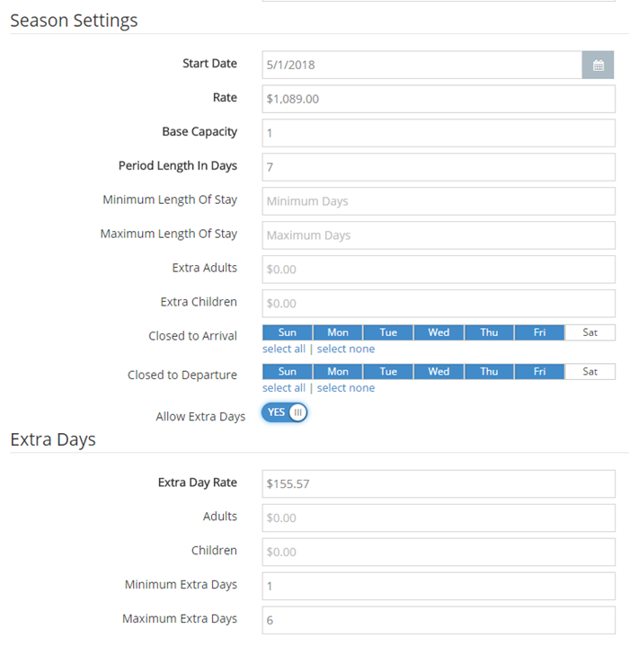 Although the extended rate seasons have a few more settings than the daily rates, they are simplified by the fact there is only one rate.