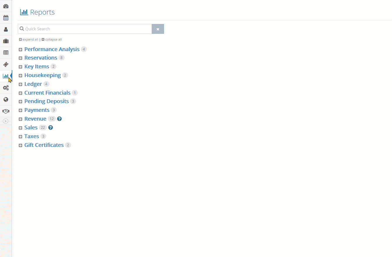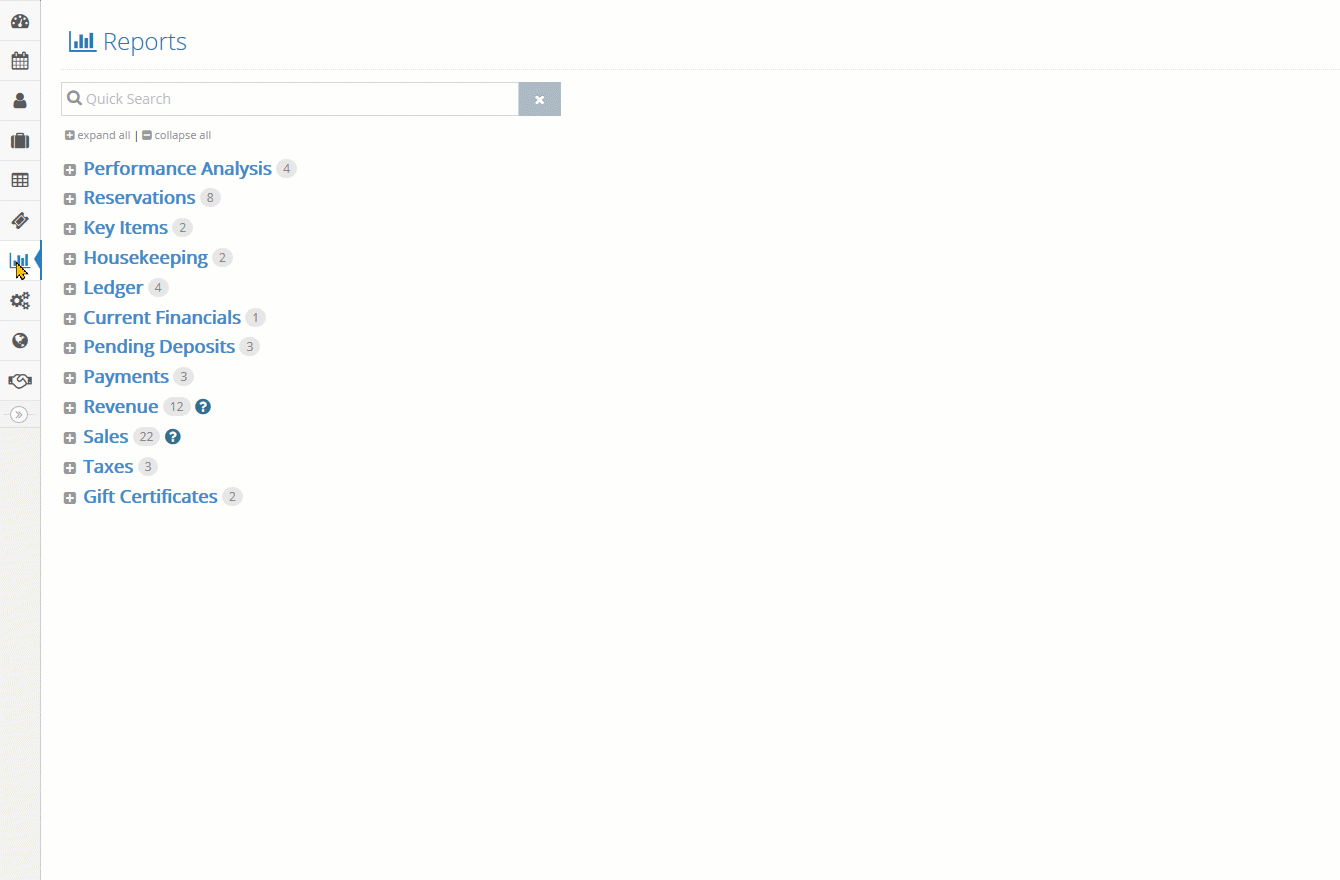 Upon your first visit to the Reports section, you’ll find a simplified view of the reporting categories available to you. Each category is expandable to see the collection of reports within. As always, you can search for reports by name or description and any matching reports will appear instantly.