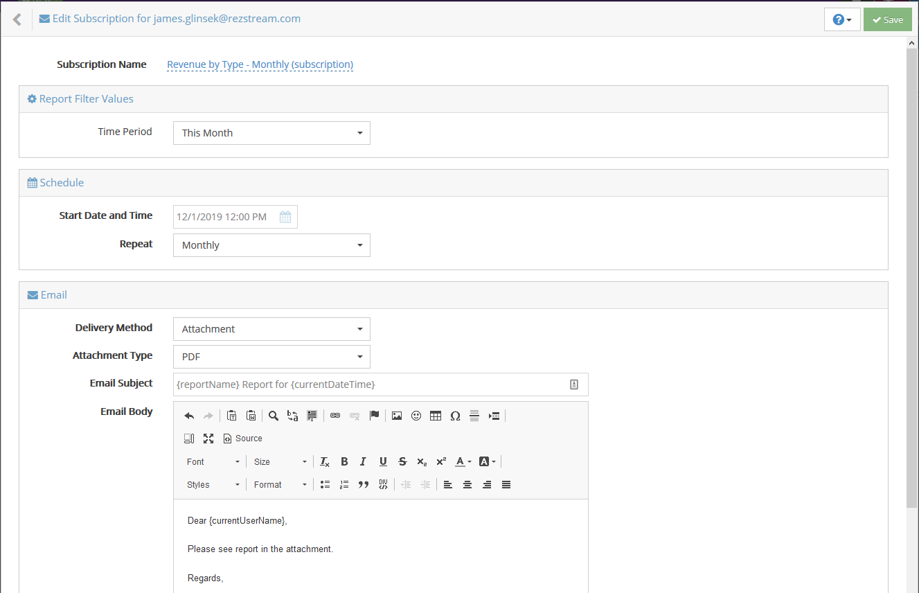 There are some reports that you need to run every day, every week, every month, etc. Enhanced Reports allow you to subscribe to any report that you need on a regular basis and have it delivered directly to your inbox on a regular schedule. No more manual effort required! Sharing a report is as simple as forwarding that email. Alternatively, feel free to add users to your rezStream Cloud account so those users can get the reports they need when they need them.