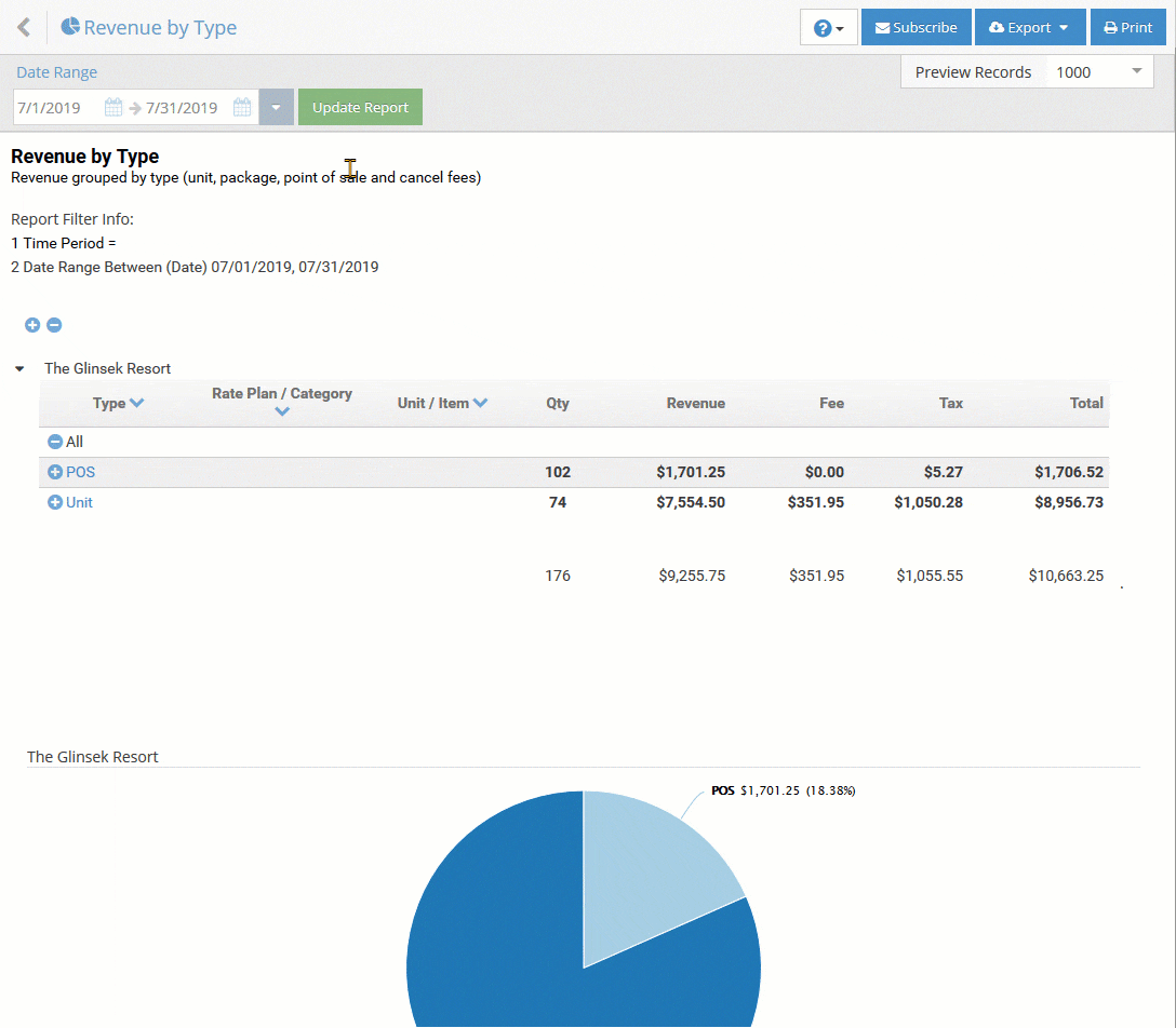 Many of the new Enhanced Reports provide the ability to drill down into the details of your data so you can see things from a high level, but also dig deeper to evaluate what is working and what isn’t. In the following example, we drill down into our Revenue by Type. We can drill down into our Point of Sale (POS) revenue to see which POS Categories are performing (and which items if we want to go deeper). Likewise, we can drill down into our Unit revenue to see the breakdown by unit type and dig deeper to look by unit and finally, even deeper to see the individual line items that comprise those totals. Even the pie chart supports drilling down!