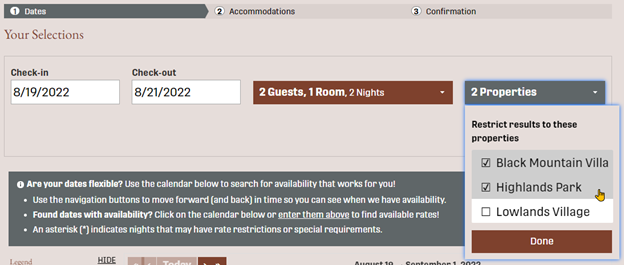 You can now enable the Search/Filter by Property feature to display a filter on your Booking Engine that allows your guests to show availability only at the property or properties that they are interested in. If you’ve got calendar widgets in use on your website, these can also be adjusted to show availability for one or more properties that you specify.