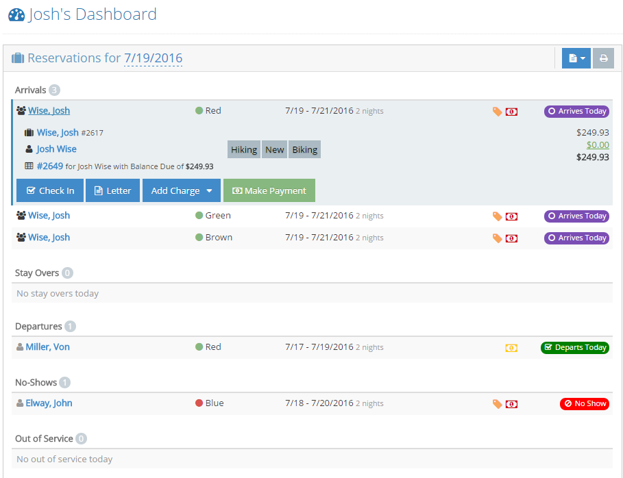 This new feature is a beefed up Reservations Today dashboard widget that streamlines the check in and check out process.  We’ve made the widget interactive which allows you to see a variety of new details about the reservations and also interact with them directly from the dashboard.