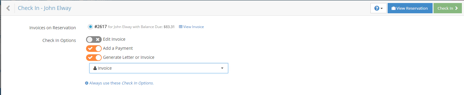 As you can see from this screen you can set default options for your Check In process.  If you always add a payment as well as print a registration card or invoice, you can set these settings as default by clicking on the “Always use these Check In Options”.  If you find yourself outside of your normal process simply select the option that does/doesn’t apply for that one time scenario.  If you are like many of our properties you likely utilize the same letter option for every Check In, the option of your choice will now be defaulted on this screen so you don’t have to annoyingly select it every time!
