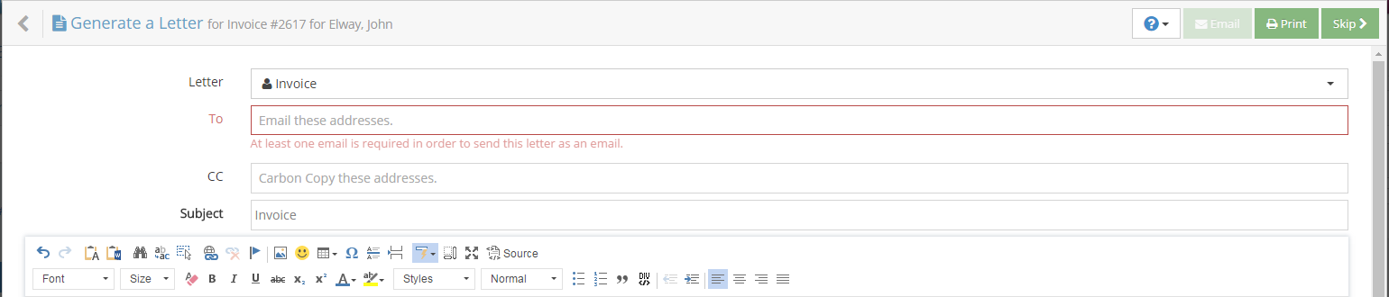 The last step in the process is the letter.  You will automatically progress to this step and the program will automatically pull up your default letter of choice.  If something needs changed you can select a different letter from the drop down menu.  If the letter step doesn’t apply to you simply indicate that in the default Check In options or skip this step on the fly.