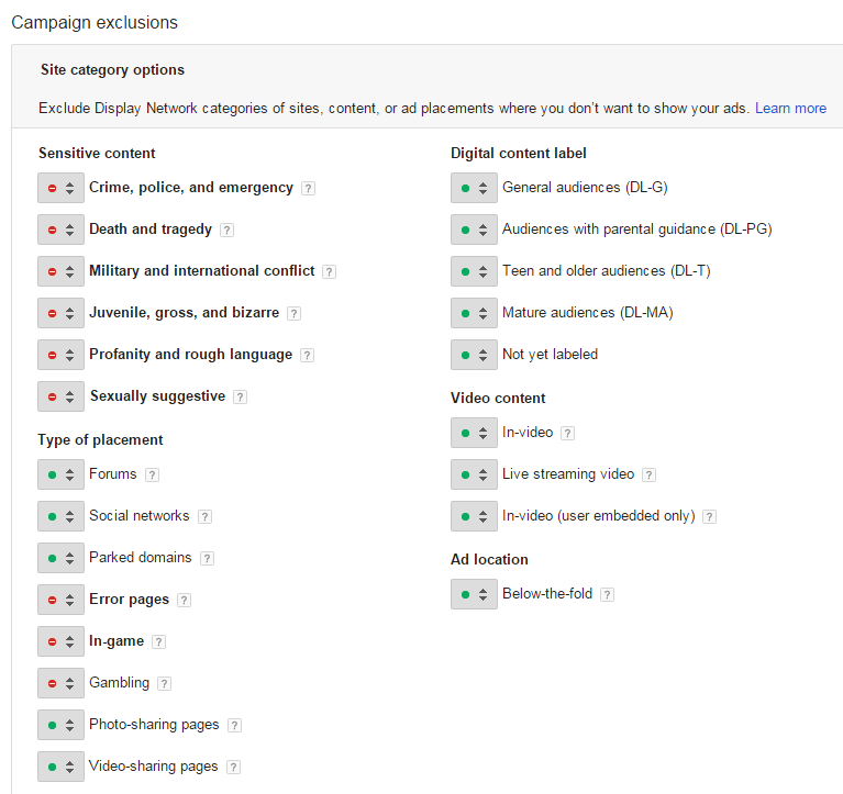 - Exclude poor content categories – You can choose what kind of websites your ads show up on, so it might be wise to avoid your ads displaying on bad category sites.