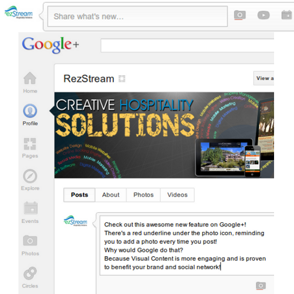 At RezStream, we are big fans of Google and love to see their methods of helping businesses be successful. The most recent, subtle- yet effective change Google implemented is the photo sharing feature on Google+. The introduction of the red line reminder under the photo icon reminds the social networker to share a photo with every post. Even inexperienced social networkers realize it’s essential to include photographs with the subtle reminder! It’s so small and simple, but hard to miss before you click the share button. Here’s a snapshot of the new reminder.