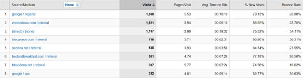 All Traffic Sources – Allows you to see where the traffic is coming in. Another important column to pay attention to is the bounce rate, which shows when someone leaves your site immediately without viewing another page. Ideally, bounce rates should be low. Any sources that result in high bounce rates will give you clues as to where to make changes to your copy, whether to renew with certain directories, and so on.