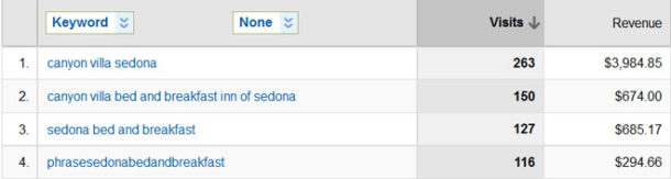 Keyword Conversions – Below you can see which keywords converted into online bookings. Again, this is helpful for PPC or SEO changes. This information is only useful if you can track revenue to the source in Google Analytics.