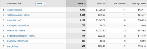 All Traffic Sources Tracking Revenue – If your online booking engine will install tracking scripts to track revenue to the source with Google Analytics, you will see incredibly useful information within the Ecommerce tab.You can see which sources produce and which do not--this information enables you to allocate your marketing dollars to the most effective sources.