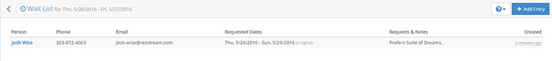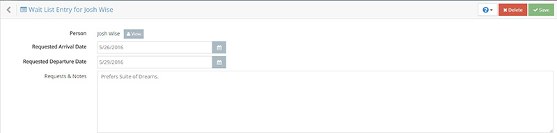The waitlist allows you the ability to track guest contact information as well as specific accommodation needs. If a cancellation occurs when you were completely booked an automatic notification of your waitlist will appear, allowing you to maximize occupancy during your peak periods. Please follow the directions below for an introduction to the waitlist feature.