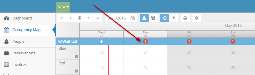 Any date(s) with a guest on the waitlist will display on the occupancy map. This can be toggled “off” by clicking on the waitlist icon described in Step 1.