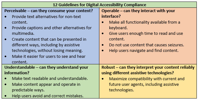 Instead, private sector websites are left with a collection of best practices, guidelines, standards, and accepted protocols for electronic accessibility. These standards are developed by the World Wide Web Consortium, or W3C, a member-driven international standards organization for the World Wide Web that ensures long-term growth for the web. The W3C has published their recommendations on electronic accessibility in their Web Content Accessibility Guidelines (WCAG) and their Authoring Tool Accessibility Guidelines (ATAG) 2.0. The latest amendment to WCAG is 2.1 and was published in June 2018. The WCAG cover 12 guidelines that describe general principals of accessible design for the internet. Be aware, these are general principals, not absolutes, and are open to interpretation.