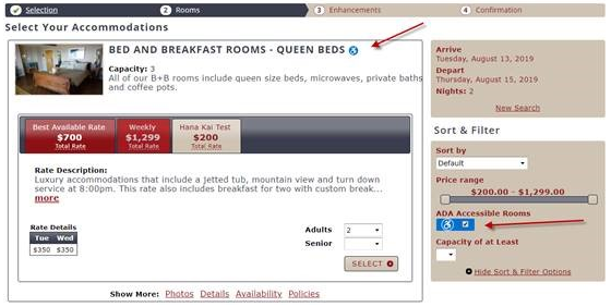 - Finally, the rezStream booking engine supports complete ADA unit filtering and searching. This is accessible on both step 1 and 2 of the booking engine, where a guest can check a box to indicate if their preference is for an ADA accessible room. The booking engine will then filter the units to display those that are marked as ADA accessible at the top of the unit search results. There will be an icon denoting that room is accessible to those with disabilities. When that reservation is downloaded into the reservation software, the software will indicate to the property that the guest has specifically selected an ADA unit. For properties without ADA units, the ADA search/filter option on the booking engine is automatically disabled so not to confuse guests.