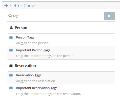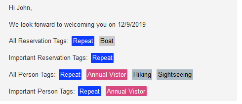 Some of you have requested the ability to print Tags on letters and this release brings that capability. Throughout our system, we give priority to the tags that you’ve flagged as “Important” and those tags appear on people and reservations on the dashboard, the occupancy map, and in your search results. And of course, all tags are displayed when viewing the full person or reservation. In keeping with that mantra, we have 4 new tags that allow you to render either the Important Tags or All Tags for a person or a reservation.