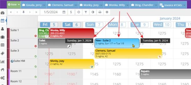 In addition to that, the selection, hover, drag, and extending styles have been updated to be more obvious and consistent (using a dashed outline). Additional information has been added to the "New Selection" box (the name of the unit, the number of nights you've selected, and the arrival/departure dates) and, finally, there are also new tooltips to re-enforce the selected arrival/departure dates: