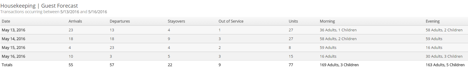The Guest Forecast report allows you to see a snapshot by day of your guests. Arrivals, Departures, Stayovers and types of guests will be reported on. This report is helpful to schedule staff, food, security and many other happenings that need to be organized at your property.